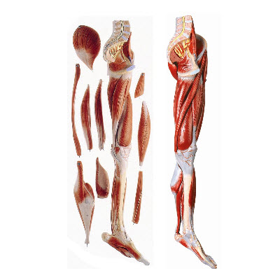 由下肢肌、阔筋膜张肌、臀大肌、缝匠肌、股四头肌、股二头肌、半腱肌、半膜肌、长伸肌、趾长伸肌、腓肠和小腿三头肌等10个部件组成,并显示髋肌、大腿肌、小腿肌和足肌等结构。