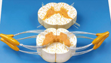 该模型由脊髓立体模型和脊髓平面模型两部分组成,显示脊髓连脊神经立体形态以及脊髓横切面等结构,共有21个部位指示标志。