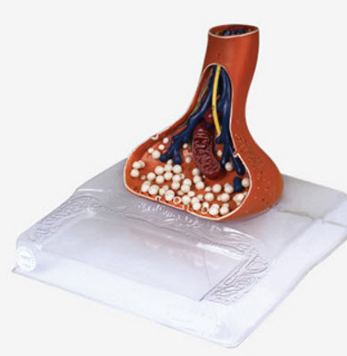 该模型显示电子显微镜下突触(化学性突触)的放大结构,可观察神经元轴突、突触前膜、突触小泡、线粒体、神经微管和神经微丝等结构,共有9个部位指示标志。