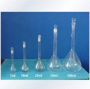 容量瓶是为配制准确的一定物质的量的浓度溶液用的精确仪器。它是一种带有磨口玻璃塞的细长颈、梨形的平底玻璃瓶,颈上有刻度。当瓶内体积在所指定温度下达到标线处时,其体积即为所标明的容积数。常和移液管配合使用。容量瓶有多种规格,小的有1ml、2ml、5ml、25ml、50ml、100ml,大的有250ml、500ml、1000ml、2000ml等。它主要用于直接法配制标准溶液和准确稀释溶液以及制备样品溶液。容量瓶也叫量瓶。