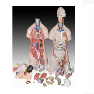 这是一款杰出的躯干模型,其特征是:脊椎露在外面,其中一段脊椎可拆下,一块女性胸腔盖和可互换的男女生殖器官,女性子宫中含有一胎儿。可分成23件:躯干,女性胸腔盖,头,眼球,脑,一块脊椎神经,肺(2件),心(2件),肝,肾,胃(2件),肠(4件),男性生殖器官(2件),女性生殖器官带胎儿(3件)。用PVC制成,安放于座上。尺寸:85CM。