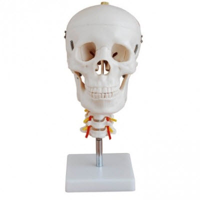 该头颅骨带颈椎模型由头骨和7节颈椎组成,带颈椎动脉,有底座。
