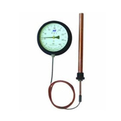 该温度计的原理是基于密闭测温系统内蒸发液体的饱和蒸气压力和温度之间的变化关系,而进行温度测量的。当温包感受到温度变化时,密闭系统内饱和蒸气产生相应的压力,引起弹性元件曲率的变化,使其自由端产生位移,再由齿轮放大机构把位移变为指示值,这种温度计具有温包体积小,反应速度快、灵敏度高、读数直观等特点,几乎集合了玻璃棒温度计、双金属温度计、气体压力温度计的所有优点,它可以制造成防震、防腐型,并且可以实现远传触点信号、热电阻信号、 0-10mA或4-20mA信号。是目前使用范围*广、性能*全面的一种机械式测温仪表。