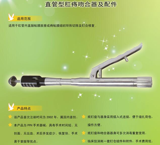 结构及组成 直管型肛痔吻合器及配件主要由可重复使用的吻合器和一次性使用的配件两部分组成,吻合器由抵钉座、管座、保险块、活动手柄、紧定螺钉、调节螺母等组成;一次性使用配件由垫刀圈、钉仓组件、扩张器座、开口扩张器内导套、扩张器内导套、接柄、钩线针组成,钉仓组件由钉仓壳体、环形刀、吻合钉等组成;吻合钉采用TA1、TA2制成;一次性使用配件应无菌。