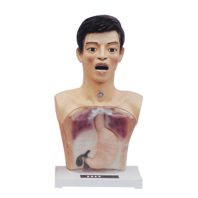 ■模型为标准的成人上半身。胸腔为解剖结构标志。透明的胸壳可直观演示操作功能。