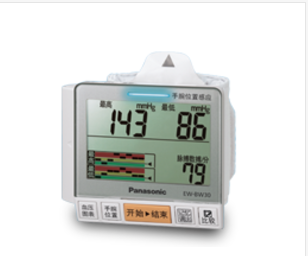 【用法用量】 1.松下血压计测量时应保持安静,使身体处于自然放松状态。 2.将收藏盒置于被测手腕下部。 3.按下手腕位置钮。手腕位置感应灯闪烁(手腕位置提示的使用方法)。 4.请稍微调整手腕角度,为了能使手腕角度正确,请稍微调整手腕的角度。正确的手腕位置测量,测量开始后,需要稍等***会儿,手腕位置指示灯才会熄灭。 5.按开始/结束按钮约2秒钟全显示。 6.测量结束后,显示血压值及脉搏数,袖带内空气自动排出;测量结果以mmHg、kPa交替显示脉搏数与血压值同时显示。测量值在高血压区域时,数字闪烁(约6秒钟);测量结果也会在图表中显示。标记记忆显示。测得的脉搏数以1分钟进行换算。 7. 关闭电源时,约5分钟后,电源也会自动关闭。