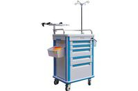 2.ABS底面注塑工艺成型,凹陷设计可防止物品滑落,台面配有304材质不锈钢护栏,台面上配透明软玻璃、左边;ABS工程塑料杂物盒,可吸入付工作台,除颤平台。右边:隐藏式升降输液架,ABS工程塑料白色网篮,双ABS污物桶分色。背后:5米外接电源线,ABS心肺复苏板,隐藏式氧气瓶基座。